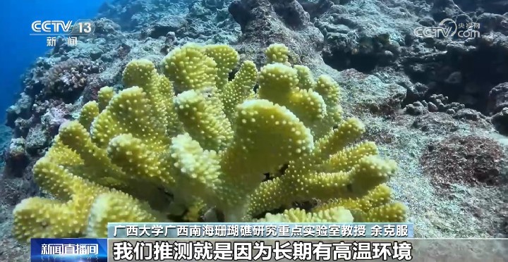 广西大学教授余克服介绍:“因为现在全球的珊瑚礁总体都在退化,退化的主要原因是全球气候变暖。但是黄岩岛这里,珊瑚反而长得比以前更好了。我们推测就是因为长期有高温、热浪的环境,使这里的珊瑚在这种自然驯化的过程中,产生了一种抵抗高温的能力。”