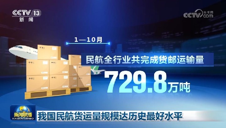 央视网消息(新闻联播):日前,中国民航局公布数据显示,今年以来,我国航空货运量保持快速增长趋势,国际航空货运增长势头明显,货运量规模达到历史最好水平。