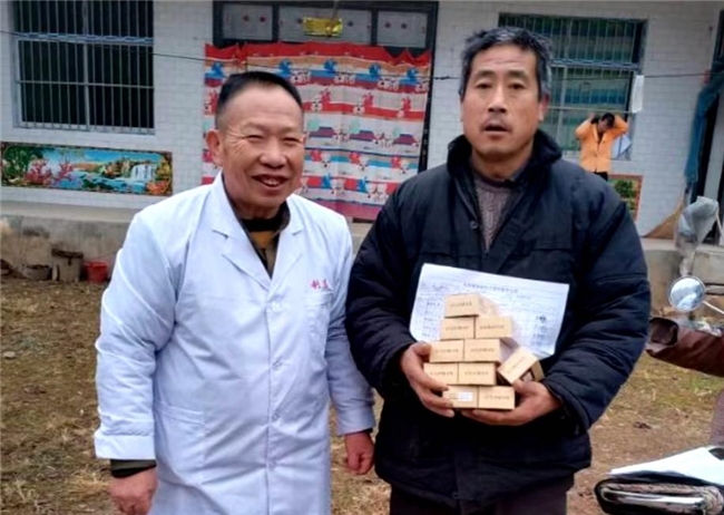 (图为:古印龙大夫疫情期间为村民赠送古龙丹覆盆子茯苓)