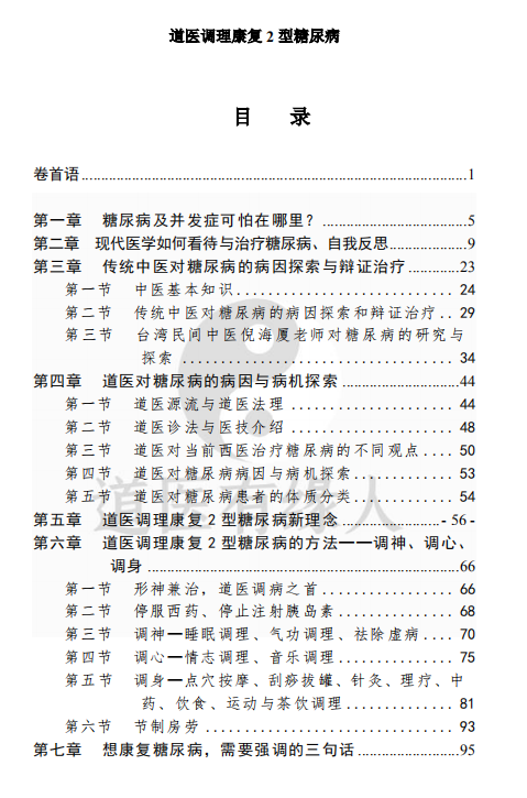 3.康复2型糖尿病是贫道的发愿——贫道准备用10年时间一步一个脚印走出一条路,宣传推广道医康复2型糖尿病的方法,用实际行动打破糖尿病不能康复的定论。 用事实告诉糖友们:糖尿病是可以康复的。信,那就试试看,从目前的案例来看,绝大部分糖有都取得了满意效果(可以参阅后文的典型案例,有名有姓,还有联系方式);不信,那就继续打胰岛素、服用降糖药,建议您继续观察道医更多的案例。