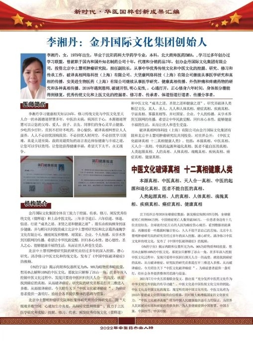 李湘丹,女,1979年出生,毕业于沈阳药科大学药学专业,本科,北大商帅医药EMBA,学习过多年创办过学习联盟,曾就职于国内和国外知名制药公司十年,代理和分销药品7年,创办金丹国际文化集团有限公司,投资北京中土慧明肿瘤研究院,担任副院长,从事中华优秀传统文化和中医文化的挖掘、研究、修习和传承工作,破译真相网络科技(上海)有限公司、大坚康网络科技(上海)有限公司继续从事医学研究和真相的传播,安美进生物医药(上海)有限公司继续从事医学研究、健康真相传播、外伤肿痛和疼痛药物的研究和各种真相传播,2016年遇到恩师,破谜开悟,明心见性.,心通打开,正心修身六年时间,身体部分潜能得到修复。优秀传统文化和上医文化的挖掘者、修习者、传承者、体道悟道行道者、传播分享者。