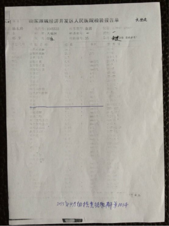 我妻子叫杨东玲,女,46岁,2005年患肾炎,2015年3月心衰住院治疗查出得了尿毒症,立即去潍坊某医院治疗,妻子原来得肾炎的时候就在那里治疗过。第二天就开始透析,当时肌酐1040个单位,结合中药透皮给药,也叫离子导入疗法治疗,这种方法只能排出身体内的免疫复合物。不能从根本上解决肾脏功能恢复的问题,但当时没有别的方法,只能一边透析,一边结合中药透皮给药进行治疗。