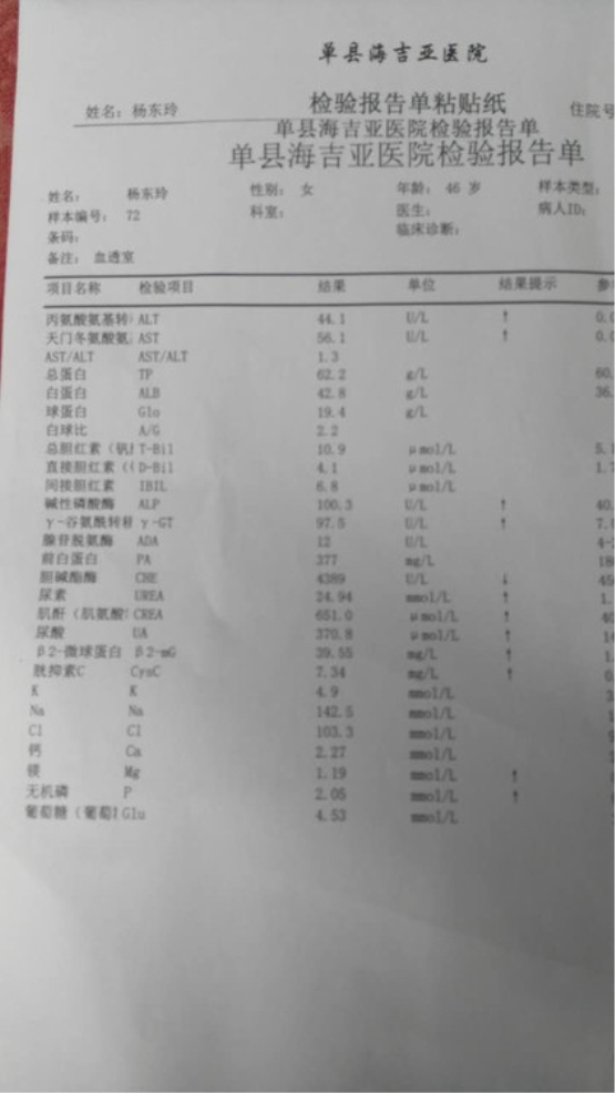 目前,在单县一家新成立的医院透析,它们的设备在山东省是位列前三名,结合好的透析机和透析器加上立信牌高活性蛋白质,地中海模式冷榨混合油,补充活性营养素,降低肌酐,活化细胞,软化血管,恢复血管的弹性,修复肾脏的功能细胞后,使她的身体状况有了明显改善。持续使用一段时间“立信牌高活性蛋白质” 营养套餐后,肌酐由1040个单位逐渐下降,现在三天没有透析的化验结果肌酐是651个单位,其他化验指标基本正常。医生对此化验结果感到惊讶,连问三遍怎么可能。并且说,你三天不透析,肌酐应该在1000左右,你有这样的结果已经很好了。随着体内毒素肌酐的下降,肾脏排尿功能也增加了一倍以上,由原来每天排尿一次,增加到2至3次。排尿数量也由原来每天300毫升增加到600毫升,意味着纤维化的肾器官已经得到修复,随之高血压也逐渐降下来了。