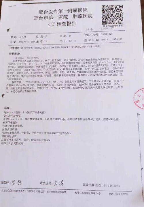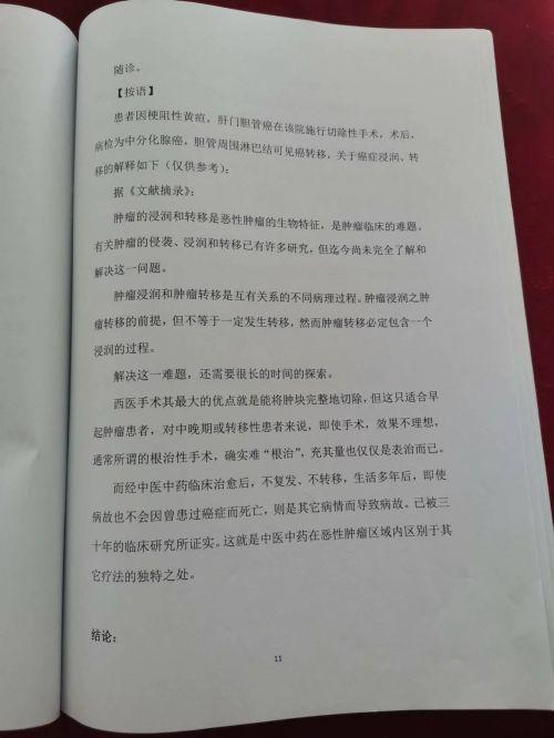 该患者经10个月的纯中药临床治愈后,不服药,不转移,不复发,五年过去了仍旧走向工作岗位,积极投身于祖国的建设事业中。于2023年7月I日隨访健状况良好。After 10 months of pure traditional Chinese medicine clinical treatment, the patient did not take medication, did not transfer, and did not relapse. Five years later, he still went to work and actively devoted himself to the construction of the motherland. Follow up on July I, 2023 showed good health condition.