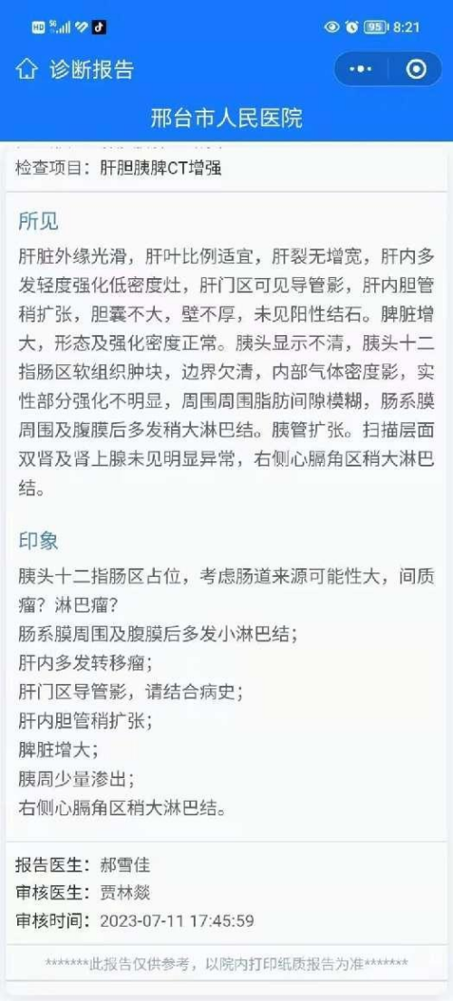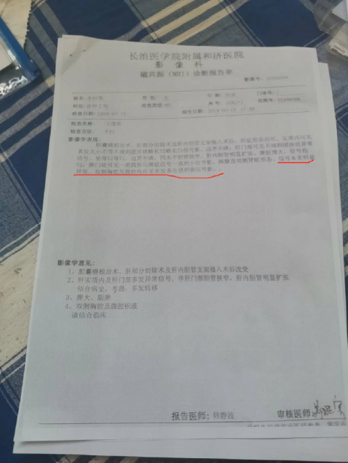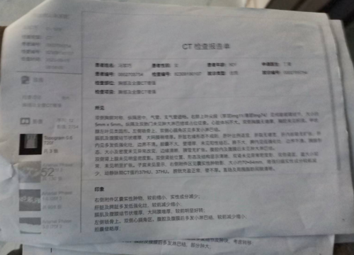 患者:陈某,湖南省岳阳市平阳县人。158mmx127mm巨型肝癌,63岁,2021年6月在湖南人民医院检查出肝硬化,胰腺钩突肿,15.8CM患者的病情已经十分严重患者因为年龄较大,身体素质不好,医院建议保守治疗。在医院医生已经放弃治疗,家人失去希望的时候,去年10月,陈胖斌的女儿通过朋友的介绍(女儿朋友母亲就是吃了陈海林教授中药治疗好了淋巴癌)认识了陈海林教授,陈教授知道了如此严重的病症非常担心,赶快安排了患者家人赶赴山西问诊,望闻问切一系列下来,陈教授根据他的多年经验开出药方,患者原本每天要以止疼药来缓解疼痛,吃了陈教授的中药半月已经不需要吃止疼药了,现在经纯中医中药治疗,十四个月化整为零,临床治愈!Case 10: Giant liver cancer