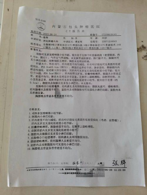 本人于2023年3月14日在北京西京肿瘤医院准备做还纳手术。经检查直肠手术处复发,僵硬,没有活力,腹腔瘀积,无法放疗。于2o23年3月18日前来我所治疗。形体消瘦,面色微黄发白,腹部胀气腹痛,吞咽困难,胃食欲极差,手术处疼痛,全身乏力,行走吃力,舌淡白苔粘腻增厚,脉治浮而弦滑。痰毒雍肿,脾胃失调,下注湿热,腑络不通。应:温脾健胃,疏通腑络,消肿散结化瘀。(腹腔功能性紊乱:腹腔内及腹膜后多发小淋巴结,膀胱壁略增厚,前列腺增生,盆腔内及双侧腹股沟小淋巴结影等基础病,都属于治疗范围)。于2023年3月18日开始服用中药,经15o余天的纯中药治疗,本人自我感觉良好。于2023年9月8日在内蒙古包头肿'医院cT报告单:影像所見:与2023年6月20日图象对比:7:直肠吻合口处壁增厚,结构紊乱及周围腹膜混浊程度较前减轻,索条影减少。