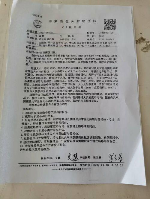 On March 14,2023, I am preparing for the return surgery in Beijing Xijing Cancer Hospital. After examination, the rectal surgery site recurred, with stiffness, no vitality, abdominal stasis, and lack of radiotherapy. Come to me for treatment before March 18,2o23. Thin body, complexion slightly yellow and white, abdominal flatulence and abdominal pain, dysphagia, stomach appetite is very poor, surgical pain, systemic fatigue, walking difficult, tongue light white coating sticky thickening, pulse treatment floating and smooth string. Sputum poison yong swelling, spleen and stomach disorders, injection of dampness and heat, viscera obstruction. Should: warm the spleen and stomach, dredge the viscera, swelling, swelling and blood stasis.(Coeliac functional disorders: multiple small lymph nodes in the intraperitoneal and retroperitoneum, slightly thickened bladder wall, prostatic hyperplasia, pelvic and bilateral inguinal small lymph nodes and other basic diseases, all belong to the scope of treatment). I began to take traditional Chinese medicine on March 18,2023. After more than 15o days of pure traditional Chinese medicine treatment, I feel good about myself. On September 8,2023, cT report in Baotou oma'Hospital, Inner Mongolia: Image comparison: Image comparison with June 20,2023:7: the wall of the rectal anastomosis was thickened, the structural disorder and surrounding peritoneal opacity were reduced than before, and the cable shadow was reduced.