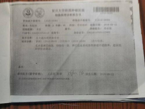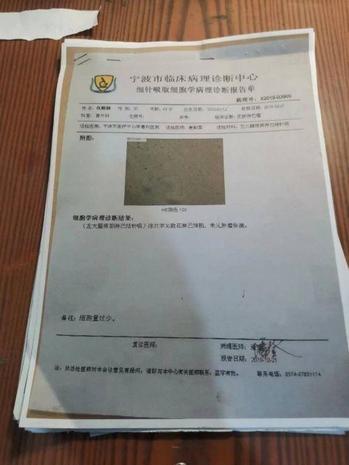 该病于2018年9月23日开始纯中药治疗,经过10个月的中医药的临床治疗,于2ol9年10月21日在宁波市临床病理诊断中心:细针吸取细胞学病理诊断报告单:附图:细胞学病理诊断结果:(左大腿根部淋巴结针吸)涂片中见散在淋巴细胞,未见肿瘤依据。The disease began pure traditional Chinese medicine treatment on September 23, 2018. After 10 months of clinical treatment with traditional Chinese medicine, it was diagnosed on October 21, 2019 at the Ningbo Clinical Pathology Diagnosis Center: Fine needle aspiration cytology Pathology Diagnosis Report Form: Attached Figure: Cytology Pathology Diagnosis Result: Scattered lymphocytes were found in the smear (needle aspiration of lymph nodes at the left thigh root), and no tumor evidence was found.