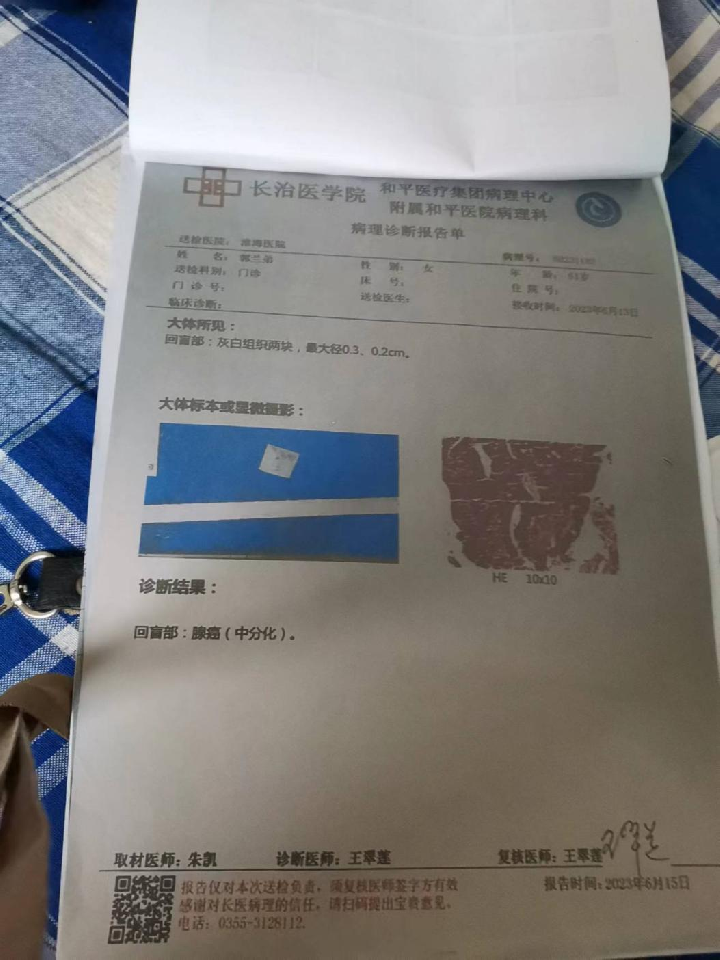 Patient Wang Chunping, 59 years old, was diagnosed with acute appendicitis in Weichang Village, Zhaozhuang Township, Lincheng County, Xingtai City, Hebei Province on January 15, 2020 at Lincheng Traditional Chinese Medicine Hospital. He underwent partial cecal resection on January 16, 2020,. On January 16-27, 2020, pathological image analysis was performed on the partially resected ileocecal material, with pathological number 4134. Pathological diagnosis: (ileocecal region) submitted for examination as adenocarcinoma tissue, with unclear structure and partial invasion of the intestinal wall muscle layer. Visit Director Chen for medical treatment before March 10, 2020; After nearly seven months of treatment and examination on October 29, 2020, the ileocecal cancer completely disappeared. Dean Chen said; It is difficult to successfully treat ileocecal cancer after surgery because Wang Chunping has invaded the muscular layer of the intestinal wall. She was unwilling to undergo a second surgical trauma and chose traditional Chinese medicine, which would surely create another miracle on her. Indeed, after seven months of psychological treatment, the disease disappeared after examination on October 2, 2020, further stimulating Wang Chunping's pursuit of a better future life.