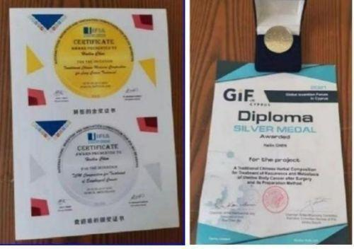 In July 2021, Professor Chen Hailin's "A Traditional Chinese Medicine Composition for Treating Cancer" was awarded a gold medal by the International Federation of Inventors' Associations. Esophageal cancer won the international gold medal, lung cancer won the international gold medal, and COVID-19 won the international merit award.