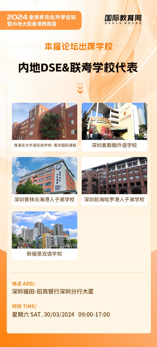 3月30日,由国际教育网主办的《2024全球多元化升学论坛暨内地大型香港教育展》将于深圳隆重举行。主办方汇聚来自大湾区优秀的国际教育领域的专家学者、行业精英,经验丰富的家长及优秀学生代表,为与会者带来高品质的讲座和激发灵感的交流。