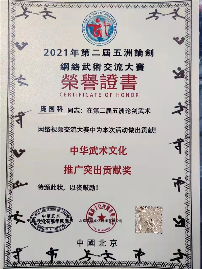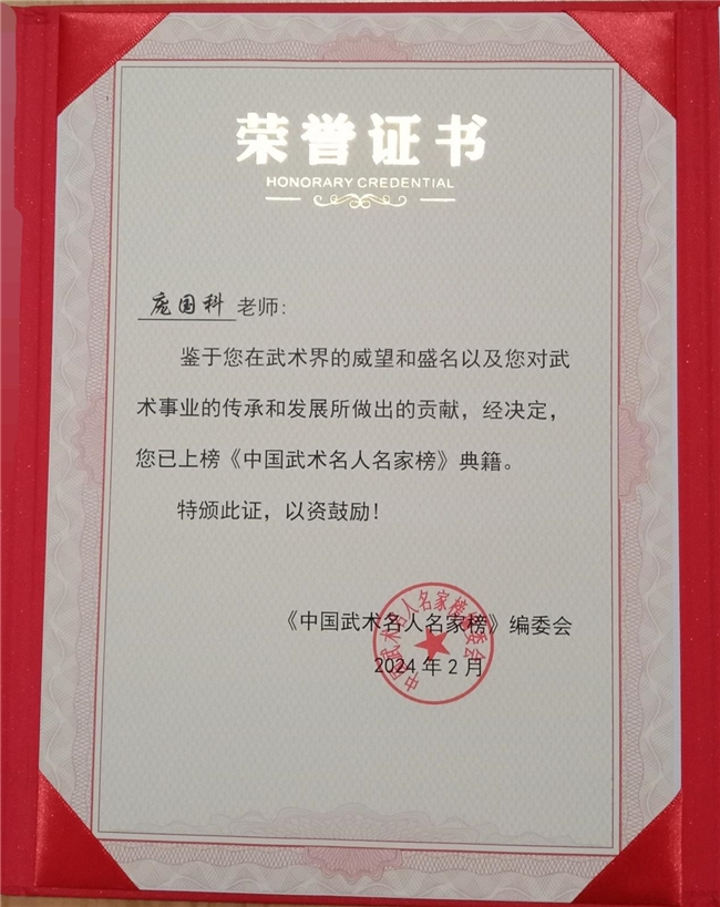 庞老师于2016年,接受乐昌新闻采访,2016年至2021年,国际武术大赛分别,获得金牌3枚银牌5枚铜牌5枚优秀奖数名,2020年世界武术日征文大赛,荣获优秀组织奖证书。中国武术名家—庞国科和进拳道于2017年入编国家邮政国家集邮中心网,获得《国家荣誉》邮票纪念发行,电话卡纪念发行,2017年,庞国科和进拳道入编,国家体育总局主管的《央级专刊》大型史册中华武术35,2017年入选全国百强武馆,2019年,庞国科和进拳道入编《见证祖国70年》荣获武学贡献证书,20182019年,庞国科入编,华夏武林精英大典两卷,荣获华夏武林精英荣誉称号,2020年,庞国科入编,当代中国武术影响力人物,荣获武术贡献证书,2020年,庞国科入编,中国武术家2021年史籍性日历,荣获优秀传承人证书,2020年,庞国科入编,中国当代武术传承人大典,荣获武术卓越成就证书,2020年,庞国科入选,中国武术名家人才数据库,荣获武术建树证书,2021年,庞国科入编,当代中华武坛名人榜,荣获武学成就证书,2021年,中国武术名家—庞国科入选,21届大采风CCTV电视人物表彰大会,并出席表彰,大会题写庞国科《扬中华武术神威》《铸民族精神丰碑》走进CCTV《智慧中国》栏目组,荣获的奖杯和证书,授予的证书由,现任第十一届全国人大外事委员会副主任委员,中共中央对外联络部原副部长,马文普首长签名颁发,武术传承名家荣誉称号证书,百佳媒体报道,2021年,庞国科入选,健康中国影响力人物,荣获授予的匾牌和武术重要贡献证书,2021年,庞国科入编,砥砺奋进新征程,荣获武术领军人物证书纪念奖杯,2022年,庞国科入编,中华武术百名精英人物,荣获武学成就证书,2022年庞国科获得,2021年北京,第二届五洲论剑武术大赛授予,中华武术文化,推广突出贡献奖,2022年,庞国科入选,当代武学楷模人物,授予的武学楷模人物证书和纪念牌匾,2022年,庞国科入编,初心映照党旗红,荣获武术领军人物作用证书,2023年,庞国科入编,中国武术名人名家榜,荣获武术威望证书,2023年,庞国科入选,新时代经典武术传播大使,荣获创新发展证书和纪念牌匾,2023年,央视采访庞国科,武术的发展未来,2024年,庞国科入选,全国师带徒模范人物,创新型武术工匠人才,荣获匾牌和武术钻研创新证书,2024年,庞国科入编,当代武术领军人物,2024年,庞国科入编,访谈华夏名人风采,2024年,庞国科入编《共和国红旗谱》荣获金牌匾和证书,2024年,庞国科入编,当代武学先锋人物,荣获央媒头条授予,当代武学先锋人物荣誉称号,2024年,庞国科入编,CCTV央视新闻特别报道,创新型武术先锋人物,荣获授予,创新型武术先锋人物荣誉称号,2024年,庞国科入编,央媒新闻特别报道,当代武学楷模人物,2024年,庞国科入登,人民日报新闻报道,师带徒模范人物,2024年,庞国科入编,CCTV央视新闻报道,武学家庞国科,时代领先人物,2024年,庞国科入编,CCTV央视新闻报道,当代武术名家庞国科,2024年,庞国科入编,CCTⅤ中文新闻报道,当代武学家庞国科,2024年,庞国科入编,CCTV央视一线官方平台,报道庞国科,人民公朴,国家栋梁,授予奖杯证书,2024年入编,腾讯搜狐新闻报道庞国科,人民公仆,国家栋梁!