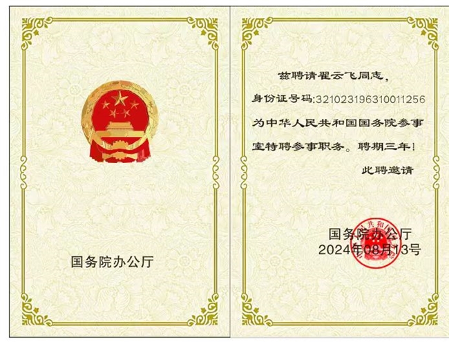 中华人民共和国国务院参事室特聘参事,中共中央纪委纪检监察特派研究员全国巡视主任。