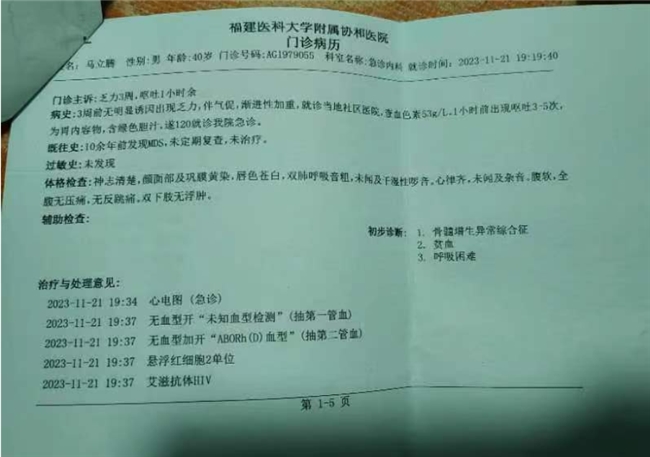 白血病一例,马立藤,男,41岁,地址:福州市仓山区浦口新城9号楼204。