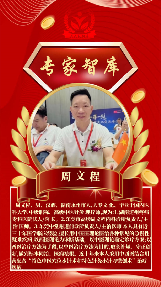 周文程、男、汉族、湖南永州市人,大专文 化、毕业于国内医科大学,中级职称、国家注册执 业医师、国家中西结合职业医师、高级中医针灸 理疗师,现为:1.湖南道州疼痛专科医院法人/院 长。2.东莞市高埗周文程内科诊所负责人/主治 医师。3.东莞中堂谢道前诊所负责人/主治医师 本人具有近三十年医学临床经验,擅长用中西医理论医治各种常见的急慢性疑难疾病,以西医理论为诊断基础,以中医理论确定诊疗方案;以西医治疗方法为手段,以中医治疗方法为目的,取长补短、守正创新,做到标本同治、医病祛根。近十年来本人采用中西医结合用药配合“特色中医穴位水针术和特色针灸小针刀微创术”治疗疾病。主要擅长医治:急慢性支气管炎、哮喘、颈椎病、腰椎间盘突出、骨质增生、眩晕头疼、高血压、中风偏瘫、心脑血管疾病、关节炎、肌键炎等久治未愈的疑难病症,通 过1-3疗程治疗,疗效立杆见影,治愈率95%以上。已治愈近千人等各种疑难杂症,疗效好、治愈率高。