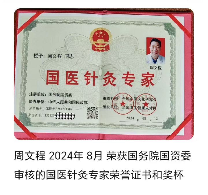 2024年3月周文程获得国家人社部、国家卫健委和国家中医药管理局三部委授予“国医大师”荣誉资格证书。