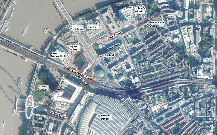 为了应对该区域基础设施落后和日益增加的人流量之间的不平衡,兰贝斯议会(Lambeth Council)提出了南岸脊柱路线(South Bank “Spine Route”)改造计划。计划将重点改造区域集中在伦敦眼(London Eye)附近的银禧花园(Jubilee Gardens)和Oxo Tower附近的西班牙伯尼花园(Bernie Spain Gardens)之间的区域,涵盖了皇家节日音乐厅及其邻近的文化场所。