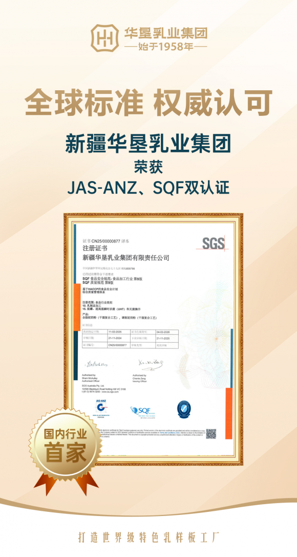 近日,华垦乳业集团正式通过国际权威认证机构的严格审核,成功斩获由JAS-ANZ(大西洋认可委员会)和SQF(全球食品行业)国际双认证,成为中国特色乳行业首家获此认证的企业。这一成就不仅标志着华垦乳业集团的质量管理体系与产品品质达到国际安全、优质水平,更为中国特色乳业参与全球竞争、实现高质量发展注入强劲的动能。