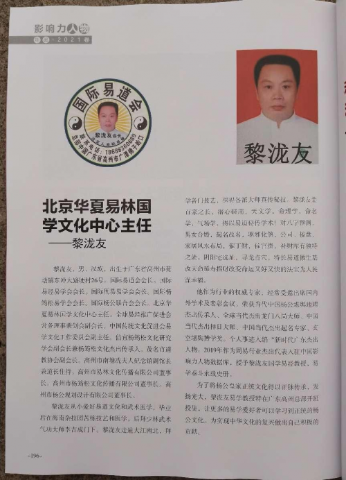 黎泷友从小爱好易道文化和武术医学,毕业后在海南杂技团苦练技艺和易学医学,后拜少林武术气功大师李吉成门下。黎泷友走遍大江南北,拜学各门技艺,深得各派大师真传秘技。黎泷友集百家之长,潜心研用,堪舆地理学。天文学,命理学,命名学,气场学,得以易道秘传学术!对八字预测,择日子,评日课,看相,立文昌局,催桃花,男女合婚姻,起名改名,驱邪化煞,公司、楼盘、家居风水规划设计布局,催丁财,催官贵,补财库有独特之处。阴阳宅选址,寻龙点穴,特长易道做生基延寿招财改变命运又好又快的法宝为人民谋幸福。