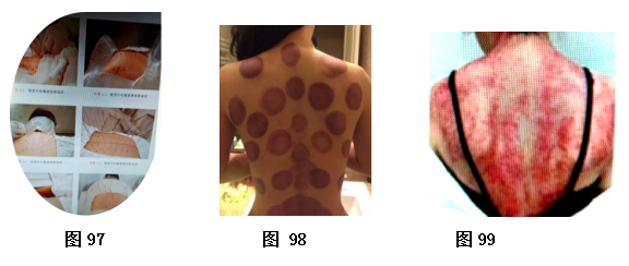 中医是以中药为主而命名,治疗也是以中药为主,药包含草药、和丸散膏丹。除药物以外还有非药物疗法,是疼痛治疗方法,含:气功、针、按、推、刮、拔、灸、热疗、电疗等。其中针、按、推、刮、拔,直接对身体肌肤,尤其针、刮、拔,有痛感甚至有些伤害,如图97、98、99。为什么要付出如此的代价呢?!