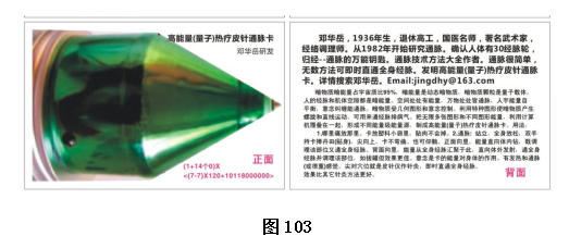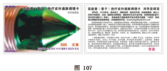4),综合通脉调理卡-高能量(量子)热疗皮针通脉调理卡。把图形量子热疗皮针通脉卡,归经通脉卡及归经通脉调理卡,皮针仪,远红外,红光等6种叠合在一起,形成一种更综合的高能量(量子)热疗皮针通脉调理卡(图107),作用更全面,效果更理想。敏感者能感受到全身经脉运行,发热,针灸等作用,并调理心、肺、脑、眼、肝,胆,脾、胰、肾、膀胱(前列线),乳卵宫,颈肩腰膝等。不敏感者感觉不到,但效果是与敏感者一样有效。