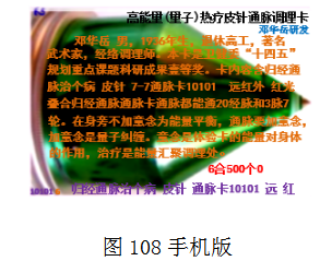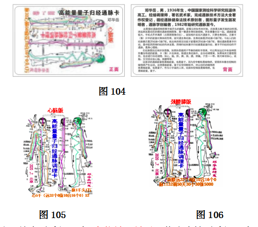 人们拿到这卡,放在体前,全身放松,意在体会卡在身上的作用,卡就会通您的全身经脉,或者既通全身经脉又自动调理您的个病。调理个病有: 如心脑版(图105),肝胆脾胰肾(糖尿病)版,颈腰膝版(图106),乳卵宫版,肾前列线版。