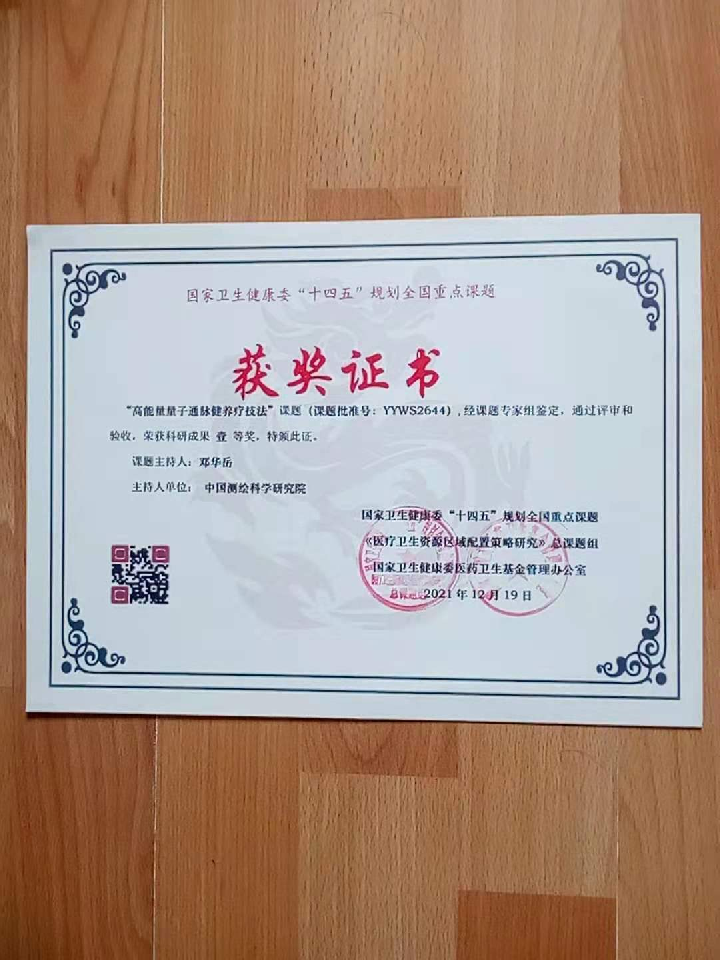 “高能量量子健养疗技法”荣获卫健委评为“十四五规划重点课题”科研成果壹等奖。包含:循经通脉健身法,手能即时通脉疗法,图形量子发生器的产品--图形量子高能量通脉健养疗技法。