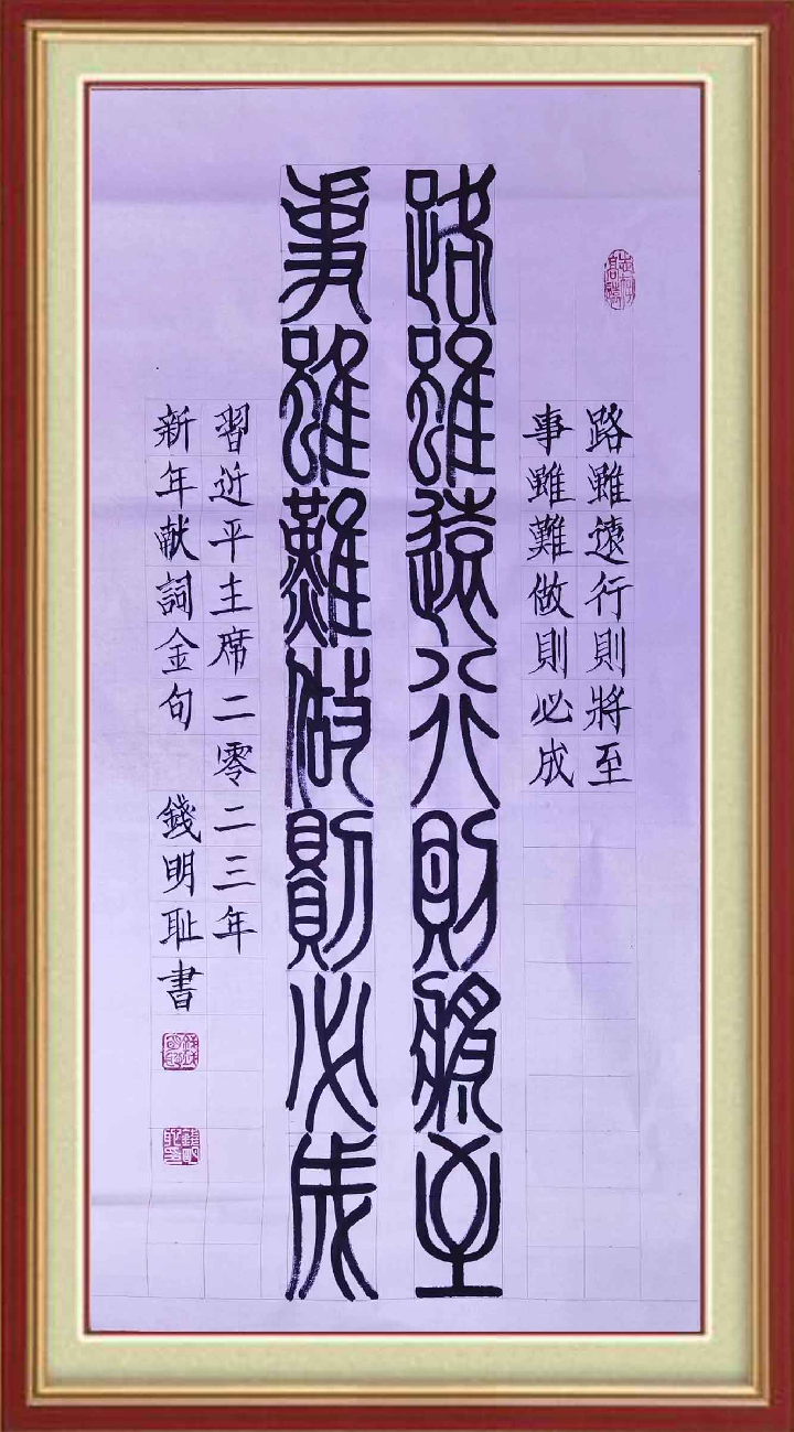 钱明耻出生于书法世家,受父亲和叔叔影响,自幼酷爱书法艺术,五岁开始临帖,小学和中学就曾获书法竞赛奖。一九八六年评定为国家一级书法师,同时加入中国美术家协会书法分会。一九九零年起历年参加全国行业系统和全国书法展赛均获特、金奖并入选专集,作品被主办单位收藏,并被国内外数十家书画研究院(会)聘任高级职务。二零一一年至二零一五年连续五年被评为中国书画500强。二零一七年评定为中国国宾礼特供书法艺术家。二零一八年两幅书法作品被中法友协推荐参加法国卢浮宫展出,并被永久收藏。二零一九年九月,四幅作品被中国文联和国家宝藏组委会收入《当代书画家名录》。