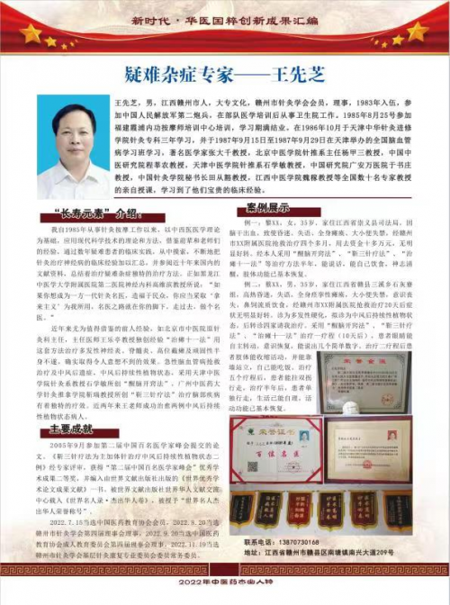 王先芝,男,大专文化,生于1962年,江西省赣州市人,中国医药教育协会成人教育委员会第三届理事、赣州市针灸学会第四届理事会理事、2021年度“百位名医”、王氏特色针灸治疗瘫痪疗法创始人,著有《“靳三针”疗法为主加体针治疗中风后持续性植物状态2例》,获优秀学术成果二等奖,被中国民间名医网授予优秀医务工作者称号。本人于1983年入伍,参加中国人民解放军第二炮兵,在部队医学培训后从事卫生工作。1985年8月25号参加福建霞浦内功按摩师培训中心培训,学习期满结业。在1986年10月于天津中华针灸进修学院针灸专科三年学习,并于1987年9月15日至1987年9月29日在天津举办的全国脑血管病学习班学习,著名医学家张大千教授,北京中医学院针推系主任杨甲三教授,中国中医研究院程莘农教授,天津中医学院针推系石学敏教授,中国研究院广安万医院工书庄教授,中国针灸学院秘书长田从豁教授,江西中医学院魏稼教授等全国数十名专家教授的亲自授课,学习到了他们宝贵的临床经验。我自1985年从事针灸按摩工作以来,以中西医医学理论为基础,应用现代科学技术的理论和方法,借鉴前辈和老师们的经验,通过数年疑难患者的临床实践,从中摸索,不断地把针灸治疗神经病的临床经验加以汇总,并参阅近十年来国内的文献资料,总结着治疗疑难杂症独特的治疗方法。