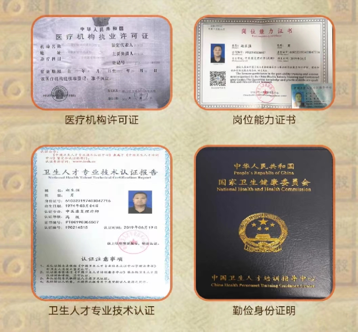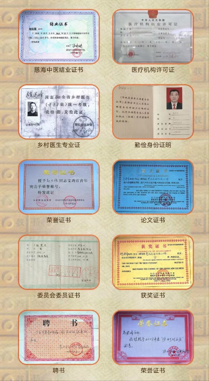 赵生强 男,49岁,出生于中医世家,家族世代从医,已有100多年历史,现任陕西候鸟时光养老产业公司康养部主任,陕西柏年聚星康养中心特约医师。其爷爷为民间医生,父亲赵建峰从小传承医术,从医50余年,擅长用中医中药治疗各种疑难杂病,尤其在不孕不育方面疗效卓著,病人遍及全国各地,远至海内外。1979年获得《赤脚医生证》书。2000年被评为陕西近代“百强名老中医”称号,2002年撰写的《羌活临床应用心得》,获得大白山中草药科研“金奖”。2005年获“陕西乡村名医”称号,荣获中华名医,和中国当代名医称号。