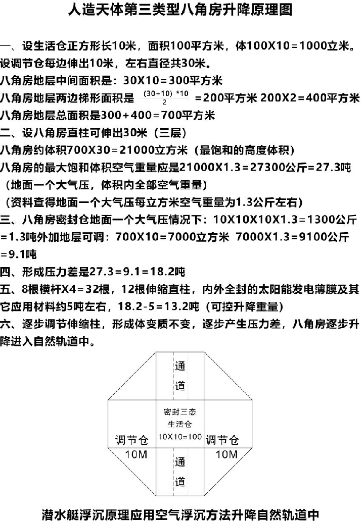像潜水艇浮沉原理方法一样,体积固定,向外抽气或进气,形成内外空气压力差,产生空气浮沉原理,在地球大气层中将人造天体八角方舟自然产生升降,能使八角方舟安全进入特定运行轨道中。这种升降方法速度慢,升降力不大。