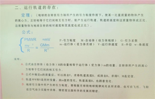 定理:《地球的自转在引力场所产生的引力粘度作用下,使某一比重质量的物体产生的离心力,正好相等于它们间相互引力时,能产生运行轨道。轨道的高度和这质量物体成正比。这质量物体与地球自转的相对速度和其高度也成正比》。