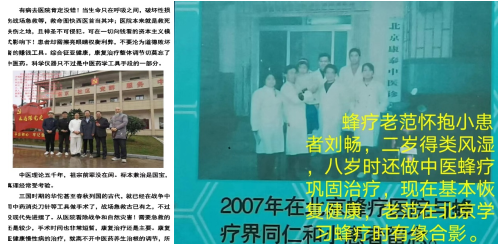 2007年,国家中医药管理局推广中医蜂疗医治骨关节病。科学证明;蜂毒中的镇痛肽可以镇痛消炎,而透明质酸酶则可以有效的降解关节病变增生的骨桥蛋白,从而治愈类风湿病。可即便中医蜂疗医治骨关节病,国家也在推广,医院还是没有蜂疗科。原因是中医蜂疗太过价廉物美,所以不被与经济挂钩的医疗部门看重。造福人民的事,好像不是医院的事。然而,病痛是折磨人,疾病不光关顾平民百姓;哪些高高在上的领导,医生,老板和中医黑,也同样会关照。只知西医不知中医的他们同样要承受西洋医学的折磨!面对疾病,也只有死要面子活受罪。科学在生命医学方面常常自欺欺人,并做了反面教材!强大科学医学,在治疗病痛时,还敌不过小蜜蜂。治疗疾病是要对症下药,恰到好处方能治愈疾病长久健康。人不能和机器一样拼凑和治疗身体,机器拼装天经地义,人类拼装违背自然;就如生孩子是女人的事,让男人生行吗?不过主流宣传机器太厉害了,它们为了利益,可以指鹿为马!颠倒是非夸大其词,受害的是人民,当然也包括他们自己。主流医学只有局部,没有整体,结局可想而知。