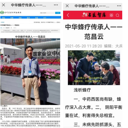 范昌云作为一名蜂疗传承人,中医文化的继承人,身上肩负着将祖国医学发扬光大的使命,如今在国家大力支持中医药发展的大好环境下,他愿倾尽一生,继续传承中医药文化,创新理论,创新思路,牢记守护生命、救死扶伤的使命,为中医药事业的发展做出积极贡献,让中华几千年岐黄之术在新时代重放光彩。