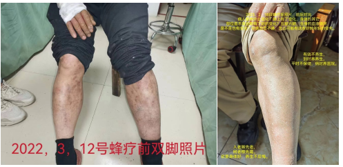 2022年9月份,本地一位中暑惊吓后遗症患者,因大热天深山沟采摘桃脂,中暑昏迷救醒后,担惊害怕四肢无力。打针吃药求神,医院医治四五十天,还是浑身无力,躺在家里。蜜蜂医疗结合化血栓药罐罐疗,仅半小时,病人立马说话铿锵有力,中气十足,二次上班干活,一疗程五次,原本身上各种病痛,也基本祛除(为什么还扯上担惊受怕:因为此山沟几年前,有过一位妇女死亡后,三个月才找到的女人,等找到时已经腐烂,所以担惊受怕)。武汉疫情的前期,我们就知道蜂疗同行李重山医生,在武汉以中医蜂疗医治新冠病毒疗效特好。我们庆幸吧!无所不能的中医蜂疗,定会给我们人类的身体健康,带来一个更好的明天。