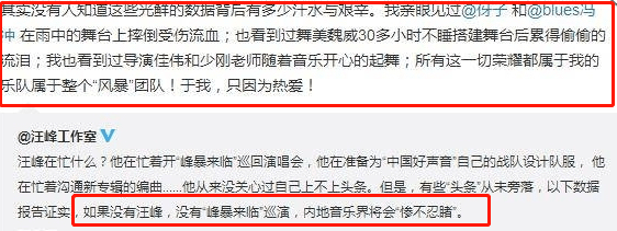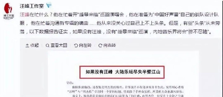 其实汪峰一直都很自信。曾经在2015年,汪峰工作室发了一篇文章,标题叫《如果没有汪峰 大陆乐坛尽失半壁江山》。